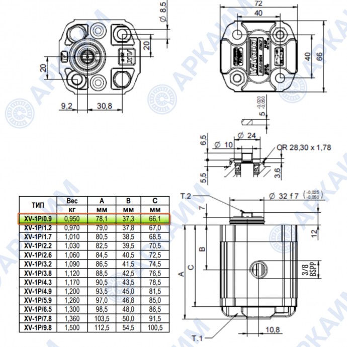 Гидронасос Vivoil X1P1651DBBA (XV-1P/0.9) 1 гр, 0.91 см3, до 5.4 л/мин, 3/8" BSPP, левое вращение
