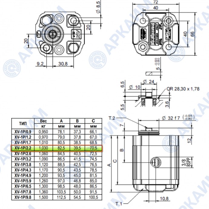 Гидронасос Vivoil X1P2051DBBA (XV-1P/2,2) 1 гр, 2,08 см3, до 13.2 л/мин, 3/8" BSPP, правое вращение