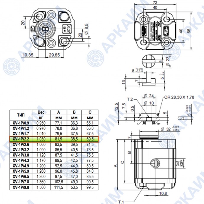 Гидронасос Vivoil X1P2031DBBA (XV-1P/2,2) 1 гр, 2,08 см3, до 13.2 л/мин, 3/8" BSPP, левое вращение