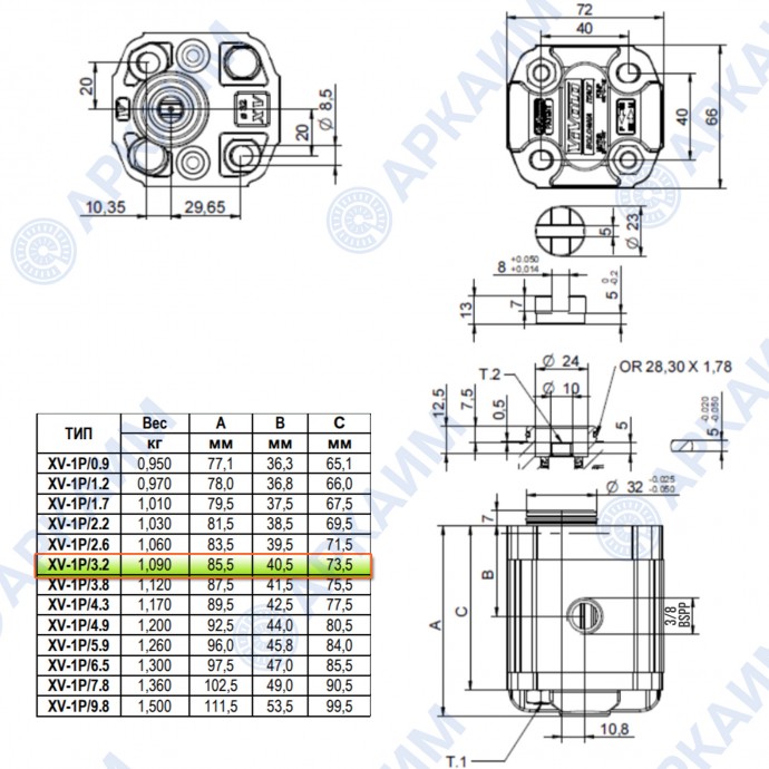 Гидронасос Vivoil X1P2331DBBA (XV-1P/3,2) 1 гр, 3,12 см3, до 19,2 л/мин, 3/8" BSPP, левое вращение