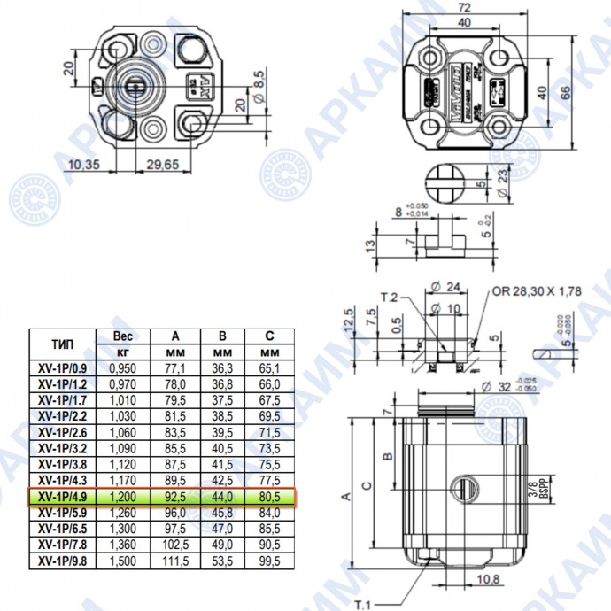Гидронасос Vivoil X1P2932DBBA (XV-1P/4,9) 1 гр, 4,94 см3, до 29,4 л/мин, 3/8" BSPP, правое вращение