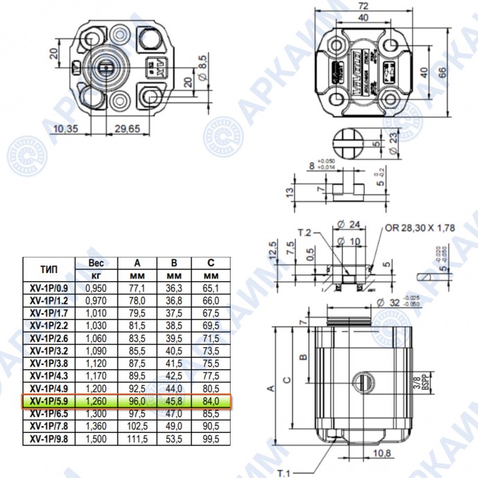 Гидронасос Vivoil X1P3131DBBA (XV-1P/5,9) 1 гр, 5,85 см3, до 29,5 л/мин, 3/8" BSPP, левое вращение