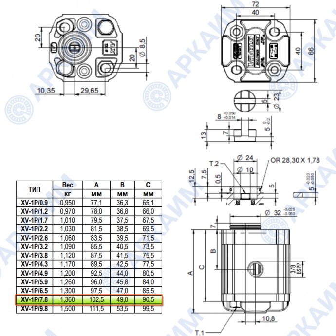 Гидронасос Vivoil X1P3431DBBA (XV-1P/7,8) 1 гр, 7,54 см3, до 39 л/мин, 3/8" BSPP, левое вращение