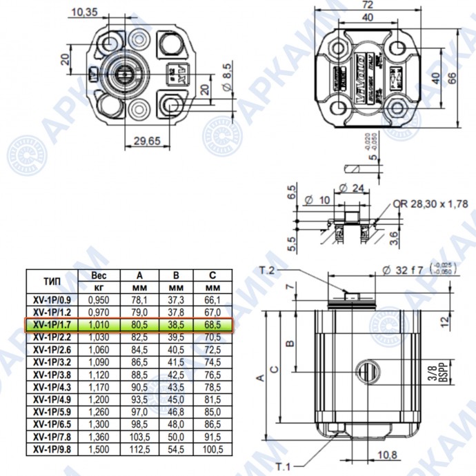 Гидронасос Vivoil X1P1841DBBA (XV-1P/1.7) 1 гр, 1.56 см3, до 10.2 л/мин, 3/8" BSPP6, левое вращение