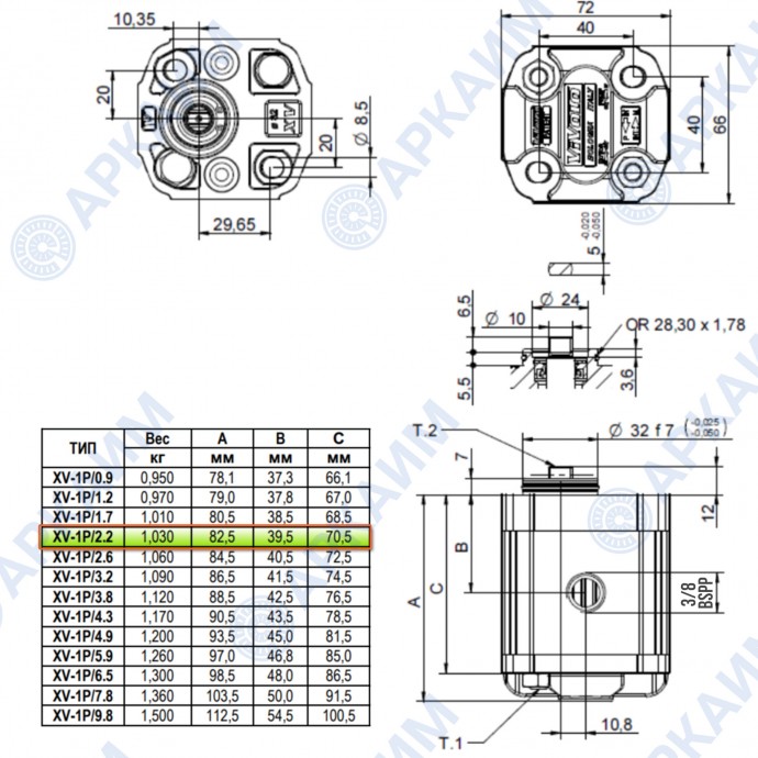 Гидронасос Vivoil X1P2041DBBA (XV-1P/2,2) 1 гр, 2,08 см3, до 13.2 л/мин, 3/8" BSPP, правое вращение