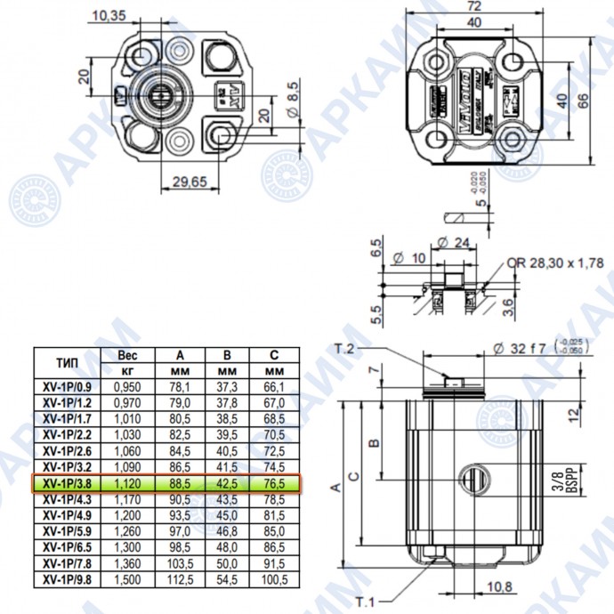 Гидронасос Vivoil X1P2541DBBA (XV-1P/3,8) 1 гр, 3,64 см3, до 22,8 л/мин, 3/8" BSPP, левое вращение