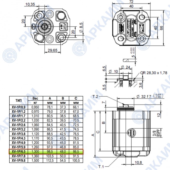 Гидронасос Vivoil X1P3241DBBA (XV-1P/6,5) 1 гр, 6,50 см3, до 32,5 л/мин, 3/8" BSPP, левое вращение