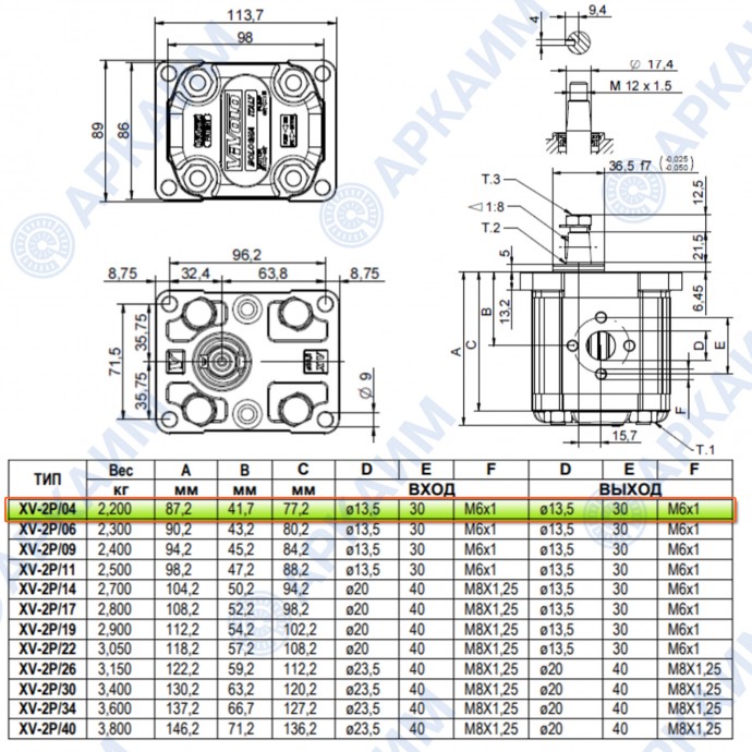 Гидронасос Vivoil X2P4101EOOA (XV-2P/0.4) 2 гр, 4.2 см3, до 14 л/мин, Ø17,4, M6, левое вращение