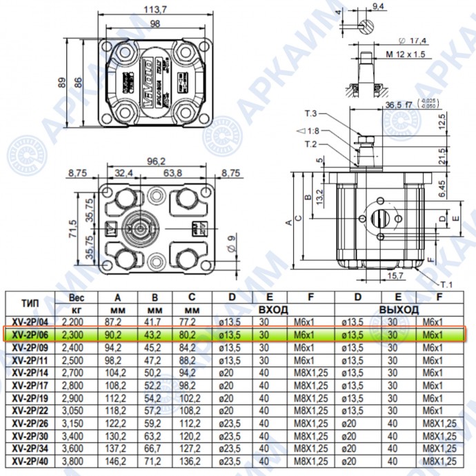 Гидронасос Vivoil X2P4301EOOA (XV-2P/0.6) 2 гр, 6 см3, до 21 л/мин, Ø17,4, M6, левое вращение