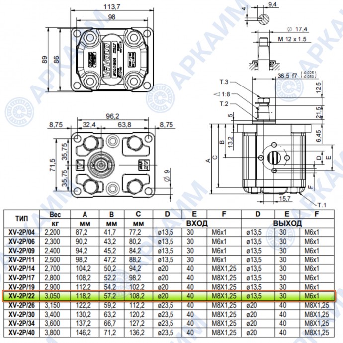 Гидронасос Vivoil X2P5501EPOA (XV-2P/22) 2 гр, 22.80 см3, до 66 л/мин, Ø17,4, M6, левое вращение