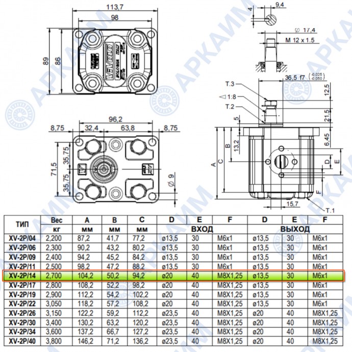 Гидронасос Vivoil X2P4902EPOA (XV-2P/14) 2 гр, 14.40 см3, до 49 л/мин, Ø17,4, M6, правое вращение