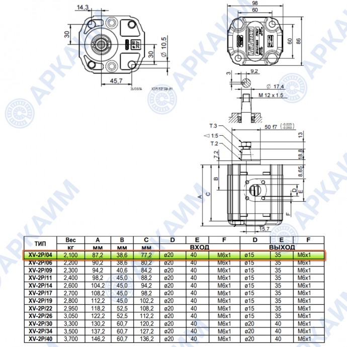 Гидронасос Vivoil X2P4111FSRA (XV-2P/0.4) 2 гр, 4.2 см3, до 14 л/мин, Ø17,4, M6, левое вращение
