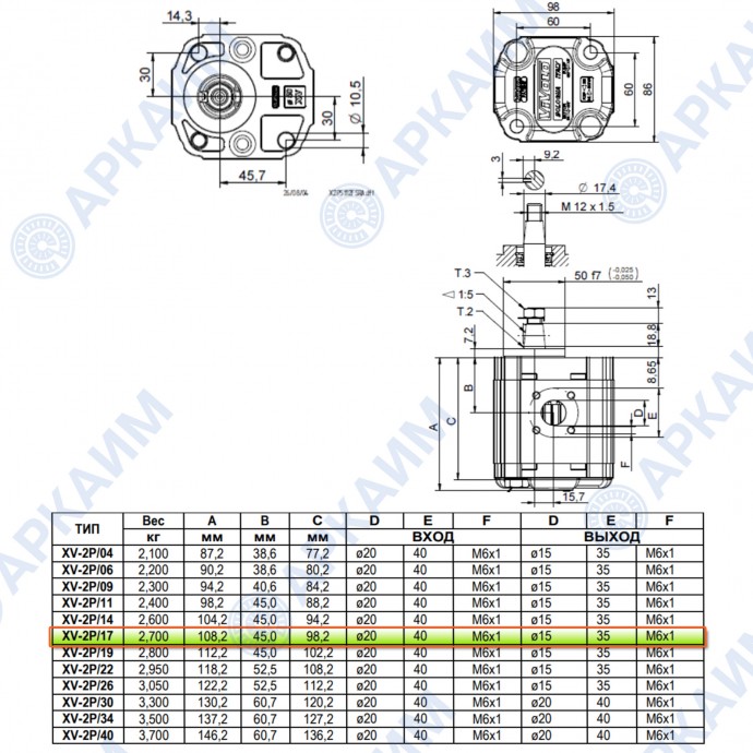 Гидронасос Vivoil X2P5112FSRA (XV-2P/17) 2 гр, 16.80 см3, до 59.5 л/мин, Ø17,4, M6, правое вращение