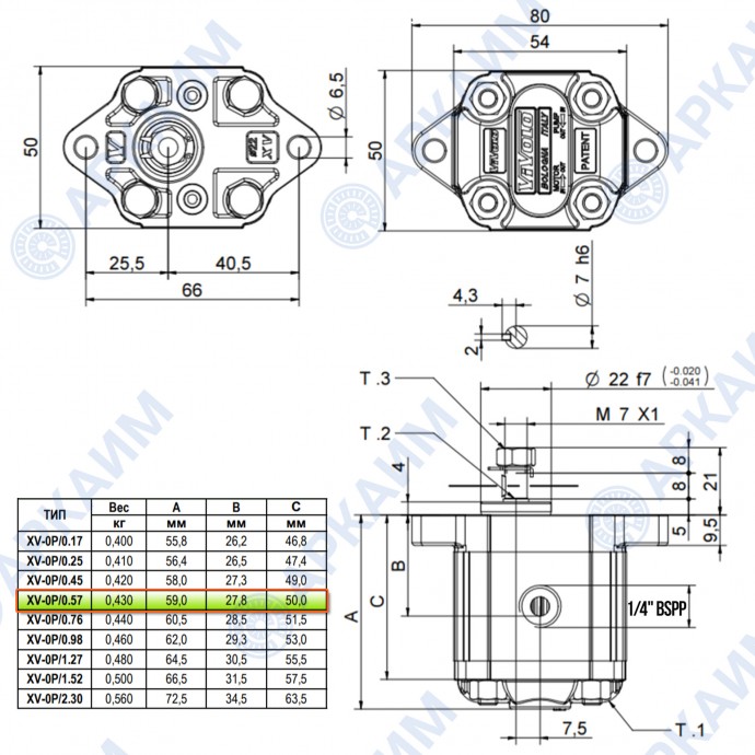 Гидронасос Vivoil X0P0502ABBA (XV 0P/0.57) 0 гр, 0,56 см3, до 4,8 л/мин, ¼ bsp, правое вращение