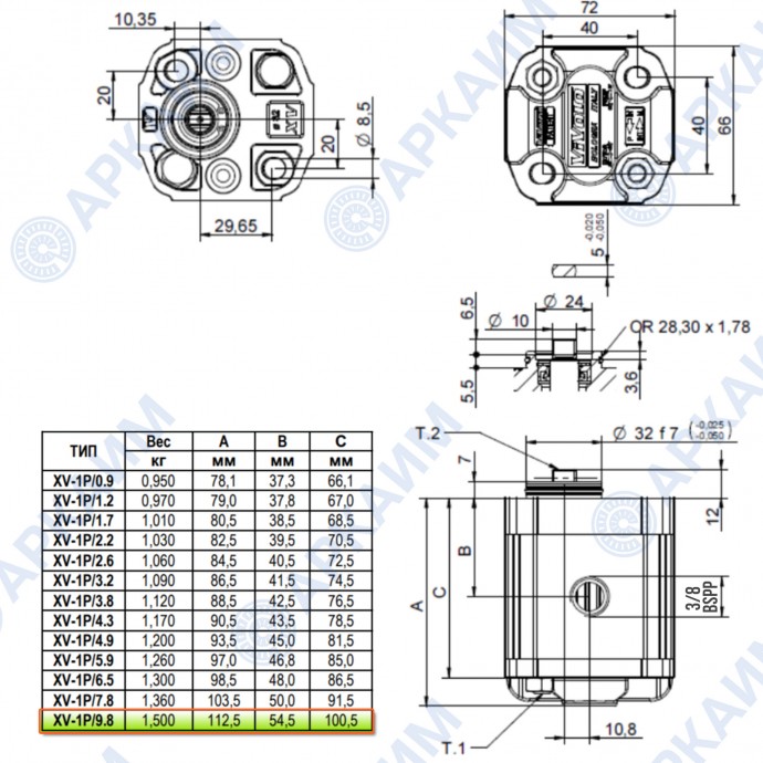Гидронасос Vivoil X1P3642DBBA (XV-1P/9,8) 1 гр, 9,88 см3, до 39,2 л/мин, 3/8" BSPP, правое вращение