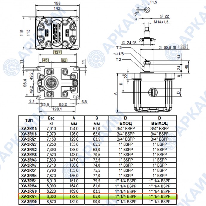 Гидронасос Vivoil X3P8701AFFA (XV-3P/74) 3 гр, 74.46 см3, до 162.70 л/мин, 1 1/4 " BSPP, левое вращение