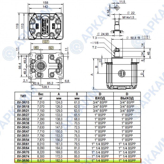 Гидронасос Vivoil X3P8901AFFA (XV-3P/74) 3 гр, 86.87 см3, до 189.81 л/мин, 1 1/4 " BSPP, левое вращение