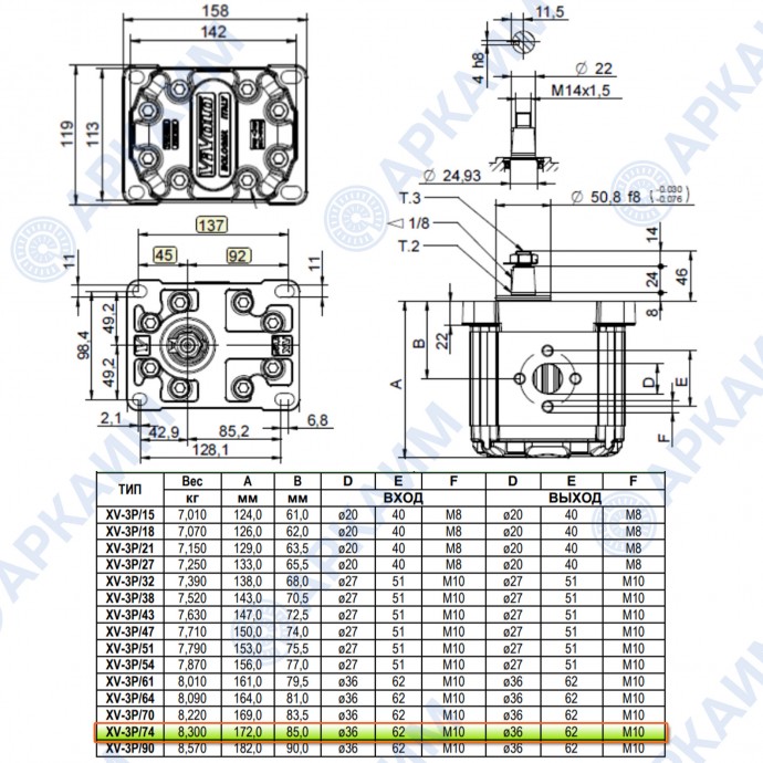 Гидронасос Vivoil X3P8901ACCA (XV-3P/74) 3 гр, 86.87 см3, до 189.81 л/мин, Ø36, M10, левое вращение
