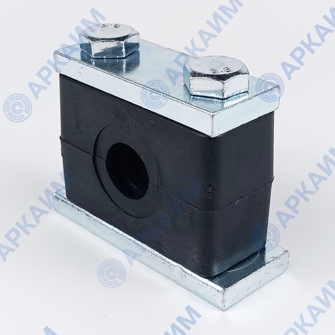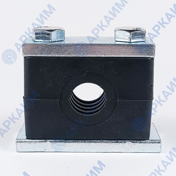 Конструкция зажима включает две колодки из нейлона, стягиваемые винтами М10 между двух металлических пластин, одна из которых приваривается к рабочей поверхности. Изделие в сборе образует отверстие под трубу с наружным диаметром 24 мм и может эксплуатироваться при температуре от -40 до +120 °С.