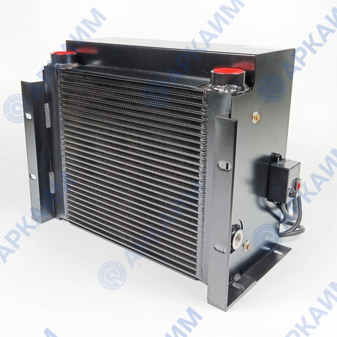 Конструкция маслоохладителя включает производительный осевой вентилятор на 24 В, закрепленный на радиаторе с помощью диффузора. Работу вентилятора регулирует термостат, вмонтированный в радиатор: реле включает обдув при достижении температуры масла 50 °С, и по мере охлаждения, отключает его. На корпусе изделия расположена электрическая распределительная коробка с предохранителем и кнопкой принудительного включения вентилятора (в обход термореле).