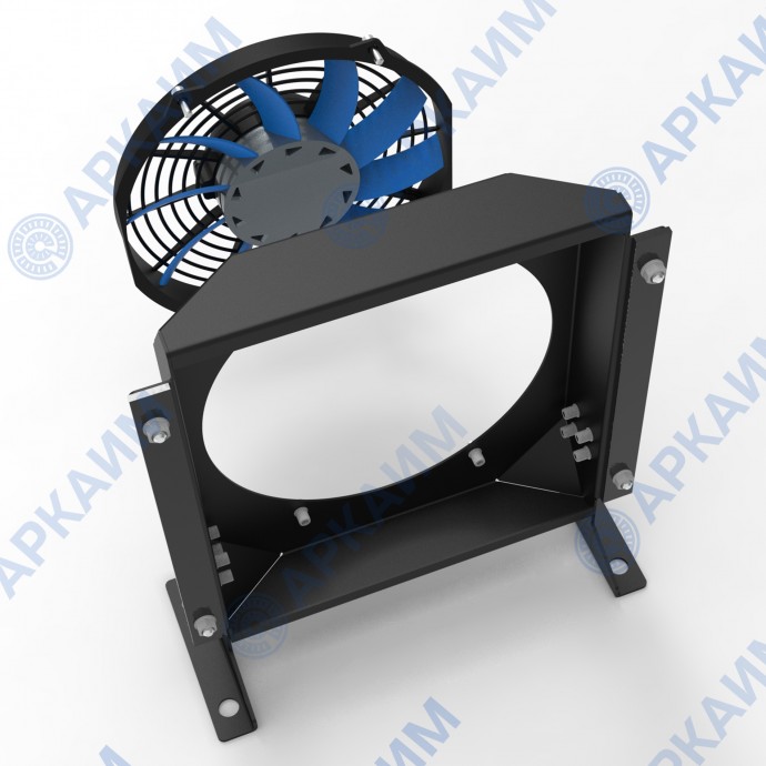 Изделие в сборе представляет собой два смонтированных компонента – металлического кожуха и вентилятора. Такая разборная конструкция ‘вентилятор + диффузор’ наиболее экономически выгодна для владельца спецтехники с маслоохладителем, сравнительно с аналогичными импортными решениями, где возможность купить комплектующие отдельно отсутствует.