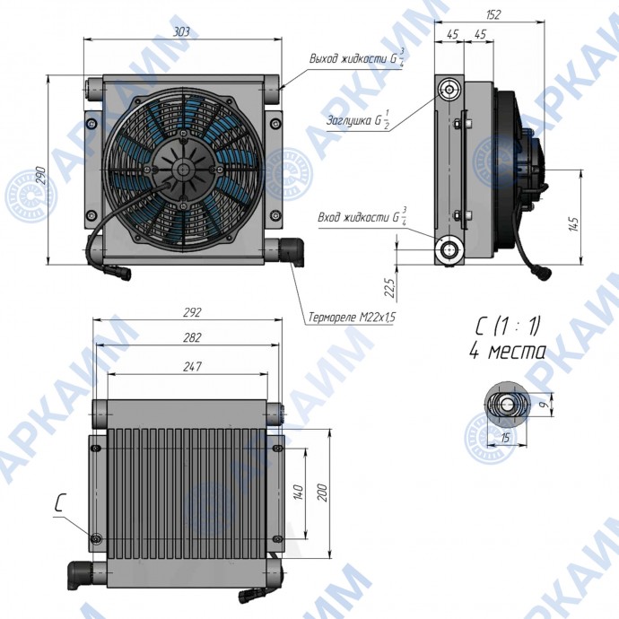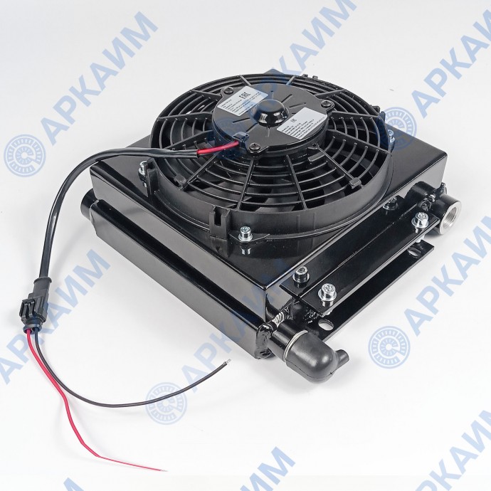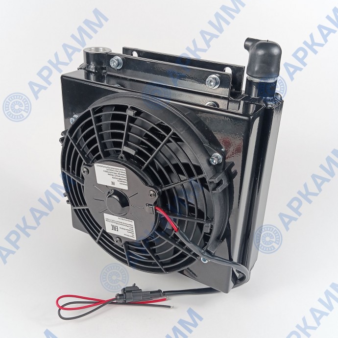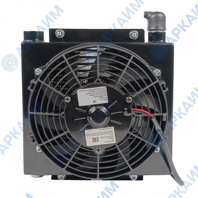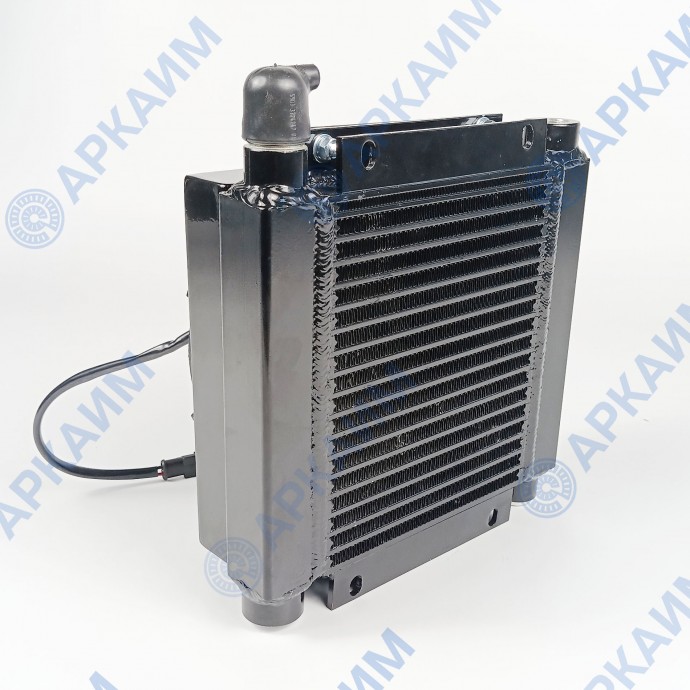 В основе классическая конструкция гидравлического теплообменника в составе с прочным алюминиевым радиатором, который обдувается автоматическим вентилятором. Термостат, установленный в резьбовой порт М22х1.5, следит за температурой масла и запускает вентилятор при температуре 60 °С, останавливает при 50-55 °С.