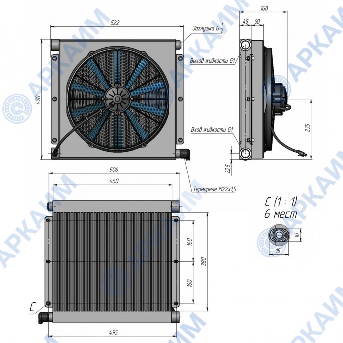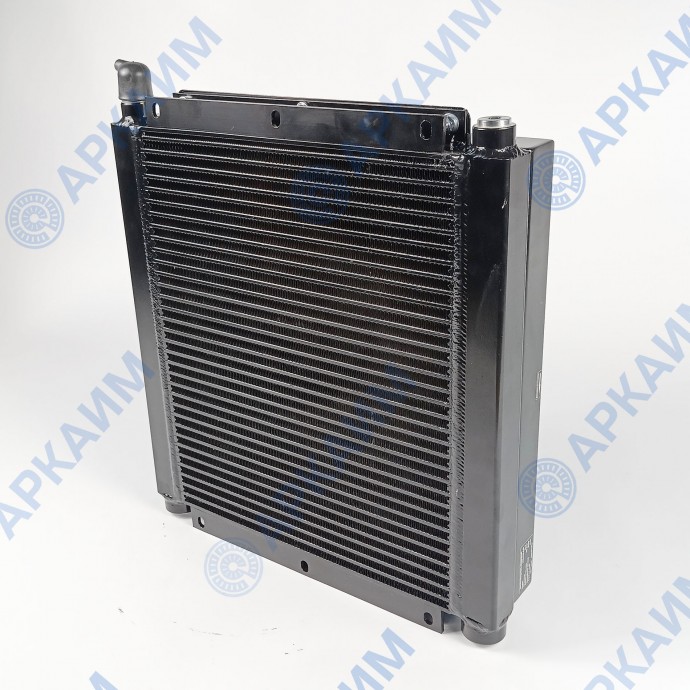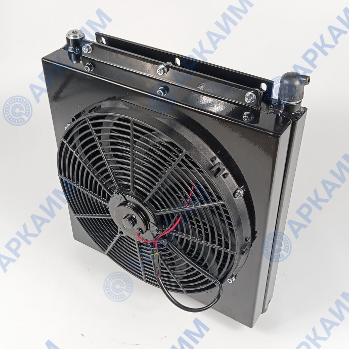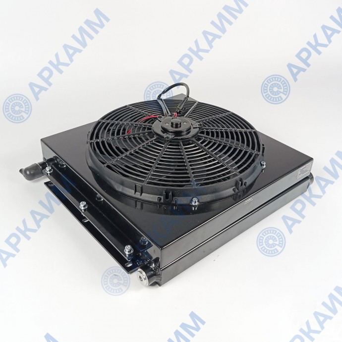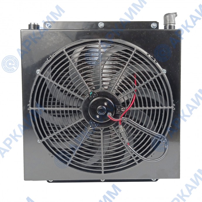 В основе классическая конструкция гидравлического теплообменника в составе с прочным алюминиевым радиатором, который обдувается автоматическим вентилятором. Термостат, установленный в резьбовой порт М22х1.5, следит за температурой масла и запускает вентилятор при температуре 60 °С, останавливает при 50-55 °С.