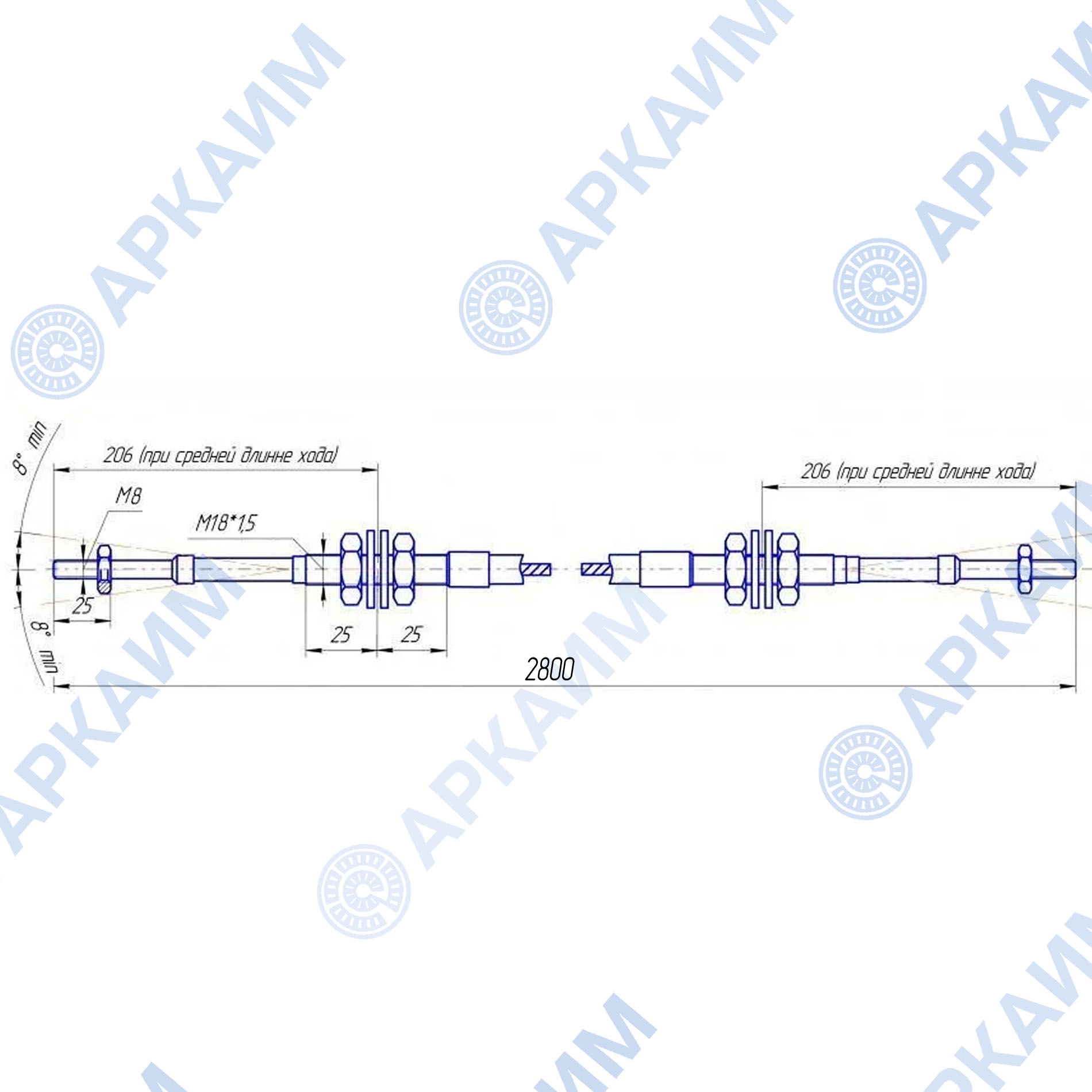 Общая длина изделия вместе с наконечниками составляет 2800 мм, а общий ход троса равен 25,4 мм.