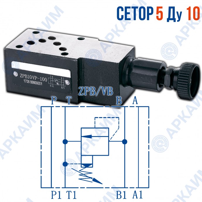 Предохранительный клапан ZPB10VB CETOP 5 / Ду 10 мм - гидравлический компонент модульного монтажа, применяемый для предохранения гидролинии от превышения давления. Настройка клапана происходит в диапазоне регулировки давлений от 0 бар до 315 бар путем вращения маховика. Монтаж модуля производится на плиту стандарта СЕТОР 5 с каналами Ду 10 мм.