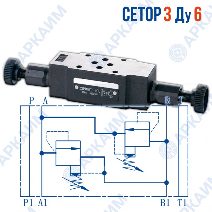 Предохранительный клапан Z2PB6VD СЕТОР 3 / Ду 6 мм - гидравлический компонент модульного монтажа, применяемый для предохранения гидролинии от превышения давления. Настройка клапана происходит в диапазоне регулировки давлений от 0 бар до 315 бар в двух линиях путем вращения маховиков, расположенных по обе стороны корпуса. Монтаж модуля производится на плиту стандарта СЕТОР 3 с каналами Ду 6 мм.