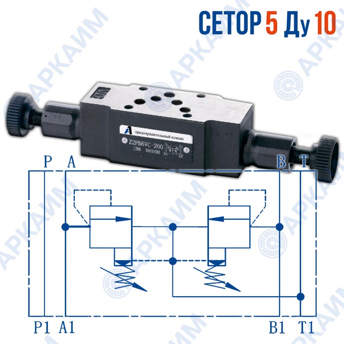Предохранительный клапан Z2PB10VC СЕТОР 5 / Ду 10 мм - гидравлический компонент модульного монтажа, применяемый для предохранения гидролинии от превышения давления. Настройка клапана происходит в диапазоне регулировки давлений от 0 бар до 315 бар в двух линиях путем вращения маховиков, расположенных по обе стороны корпуса. Монтаж модуля производится на плиту стандарта СЕТОР 5 с каналами Ду 10 мм.