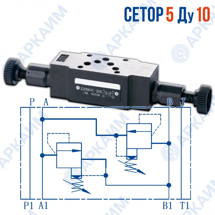 Предохранительный клапан Z2PB10VD СЕТОР 5 / Ду 10 мм - гидравлический компонент модульного монтажа, применяемый для предохранения гидролинии от превышения давления. Настройка клапана происходит в диапазоне регулировки давлений от 0 бар до 315 бар в двух линиях путем вращения маховиков, расположенных по обе стороны корпуса. Монтаж модуля производится на плиту стандарта СЕТОР 5 с каналами Ду 10 мм.