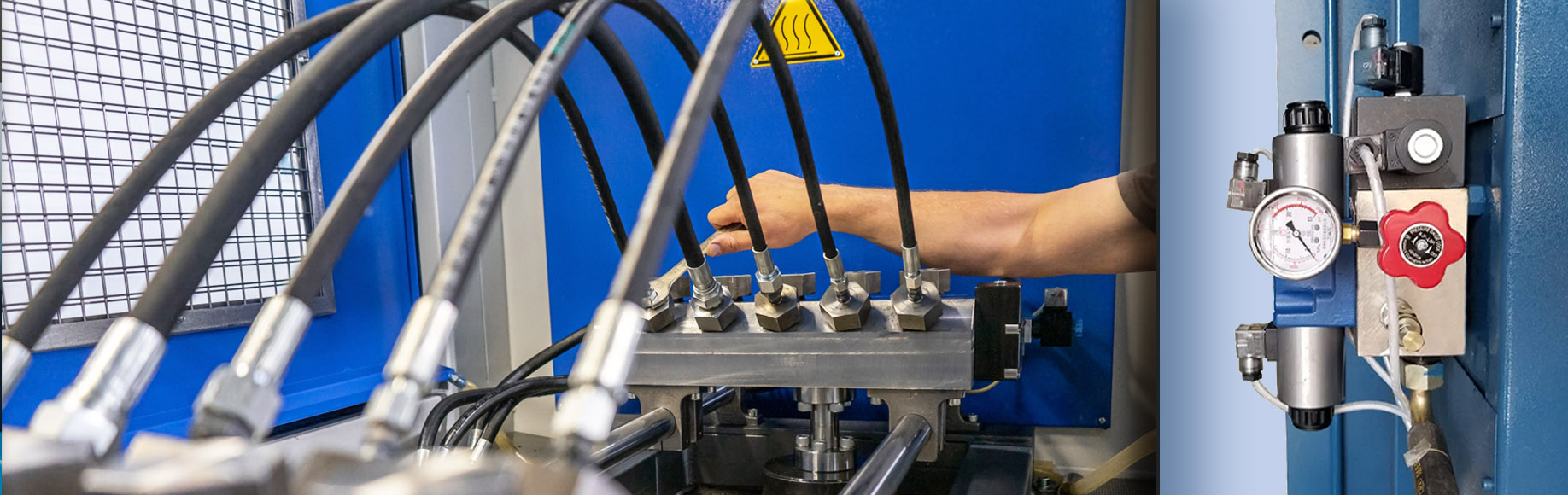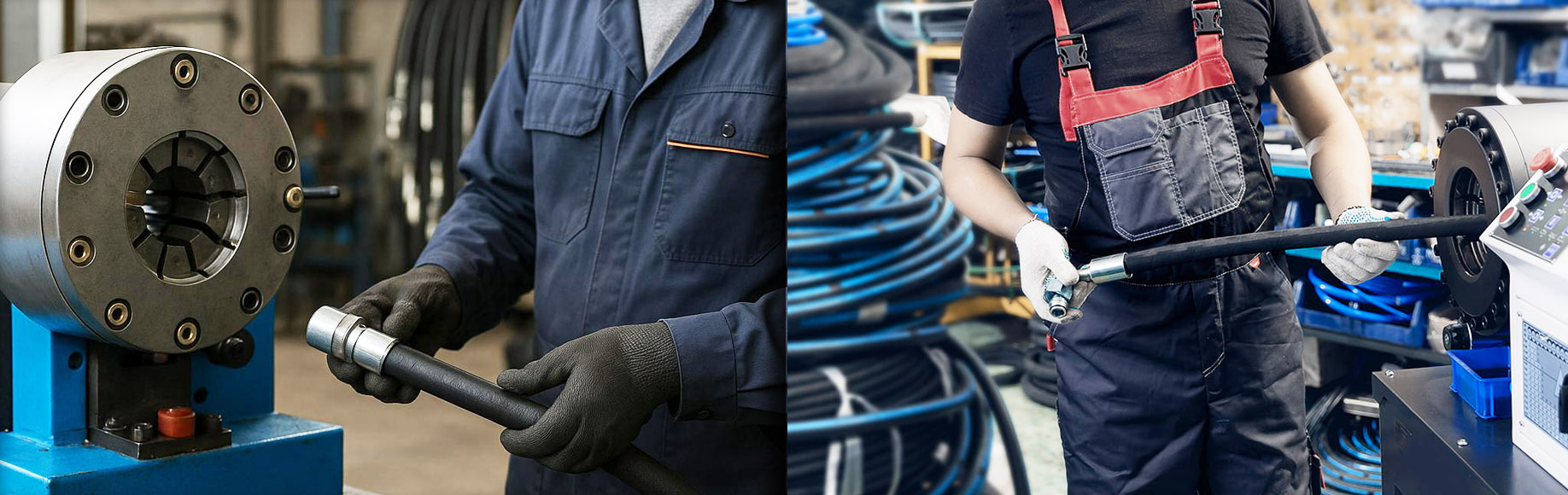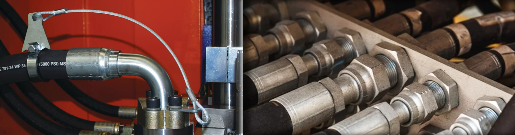 ¤ Обжим РВД на специализированном станке: жесткое соединение обоих сторон рукава с выбранными фитингами.