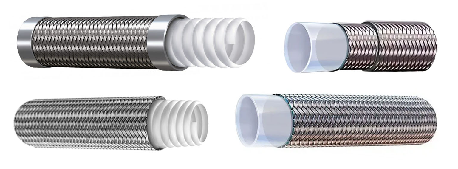 Внутренняя трубка: Изготавливается из фторопластов (ПТФЭ, FEP, PFA, PVDF), которые обеспечивают химическую инертность и гладкость поверхности. Либо с гофрированной внутренней поверхностью для свойств особой гибкости.